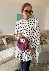 • Femme portant un foulard marron et une robe blanche à pois, tenant un sac rond violet, debout dans un salon avec un canapé beige et un vase de tulipes.