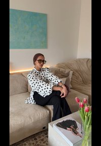 Femme en veste en cuir noire et pantalon blanc à pois tenant un sac violet, debout dans un salon moderne avec un canapé beige et des tulipes.