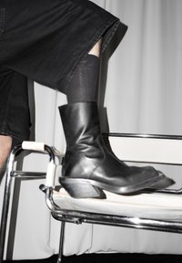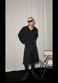 Personne aux cheveux blonds courts et lunettes de soleil, appuyée contre un mur blanc, portant un pull noir surdimensionné, un pantalon large en cuir, des bottes noires et une cravate noire.