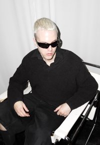 Personne aux cheveux blonds courts et portant des lunettes de soleil noires, vêtue d'un blazer noir surdimensionné, d'un pantalon noir ample et de bottes noires, debout contre un mur blanc.