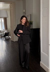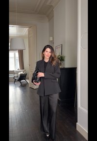 • Femme en tailleur-pantalon noir tenant une pochette assortie, debout dans une pièce lumineuse avec un sol en bois foncé et un mobilier moderne.