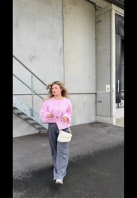 • Femme blonde portant un pull rose, un pantalon gris à jambes larges et des baskets blanches, tenant un sac blanc et des lunettes de soleil près d’un escalier en béton.