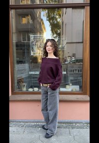 • Pull bordeaux à épaules dénudées avec encolure côtelée, associé à un pantalon gris ample et une ceinture à boucle argentée ; tissu texturé, coupe décontractée.