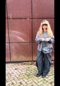 • Pull gris surdimensionné en maille torsadée associé à un pantalon noir à fines rayures avec un design drapé unique. Porte un sac à bandoulière multicolore.