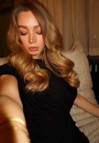 • Jeune femme aux longs cheveux blonds bouclés, portant un haut noir, assise sur un canapé beige texturé, regardant vers le bas les yeux fermés.