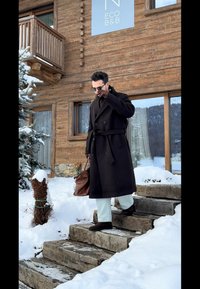 • Manteau noir à double boutonnage, associé à un pantalon bleu clair et des bottes foncées, debout sur des escaliers en bois à côté d'un arbre enneigé.
