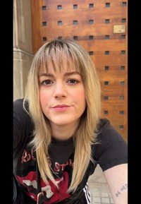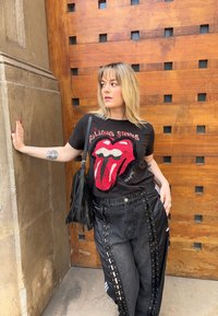 • Femme aux cheveux blonds mi-longs s'appuyant contre un mur, portant un t-shirt noir des Rolling Stones, un pantalon noir à lacets, et un sac noir à franges.