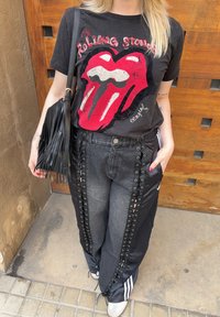• Personne portant un t-shirt noir des Rolling Stones, un pantalon rayé à lacets noir, des baskets blanches, et portant un sac à franges noir.