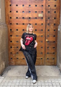 • Femme portant un t-shirt noir des Rolling Stones et un pantalon noir lacé se tient contre une grande porte en bois avec des découpes carrées.
