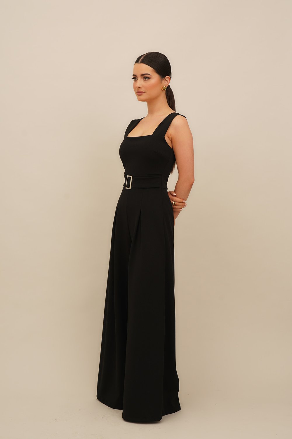 Une femme en combinaison bleu cobalt tient un microphone. Elle porte des lunettes, des chaussures argentées avec des nœuds, et elle tient une pochette métallique devant un fond rouge.