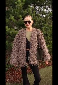 • Manteau texturé, marron et duveteux avec manches longues, porté sur un haut vert et un pantalon noir ; comprend un sac à bandoulière vert et des lunettes de soleil.
