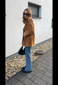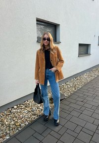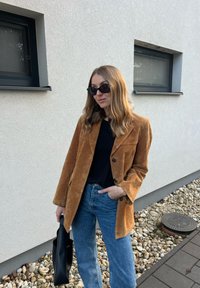 • Femme portant un blazer en suédine marron, un haut noir, un jean bleu, des bottes noires et des lunettes de soleil, debout sur un chemin pavé à côté d'un mur bordé de cailloux.