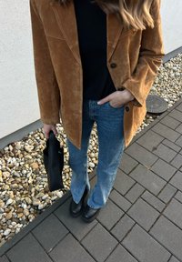 • Femme portant un blazer en daim marron, un haut noir, un jean bleu avec des fentes à l'avant, des bottes noires, tenant un sac à main noir, debout sur un sol pavé près de pierres.