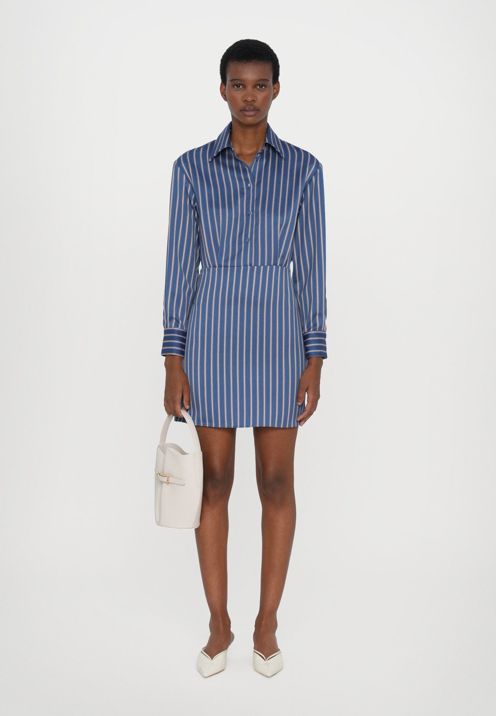 Robe chemise à rayures bleues et blanches avec un col blanc, des manches longues et un ourlet évasé, associée à un petit sac à main beige et des mocassins noirs.