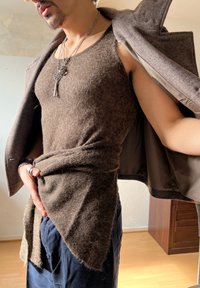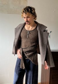• Homme portant un haut marron duveteux sans manches avec une ceinture assortie, un collier clé en argent, des bagues, et un blazer gris posé sur les épaules à l'intérieur.