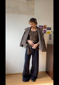 • Jeune personne aux cheveux bouclés porte un pull marron et une veste, un pantalon large noir, debout à l'intérieur à côté d'une commode en bois avec des cartes postales sur le mur.