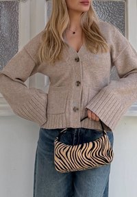• Femme portant un cardigan beige boutonné et un jean bleu, tenant un petit sac à main imprimé zèbre devant une fenêtre texturée.