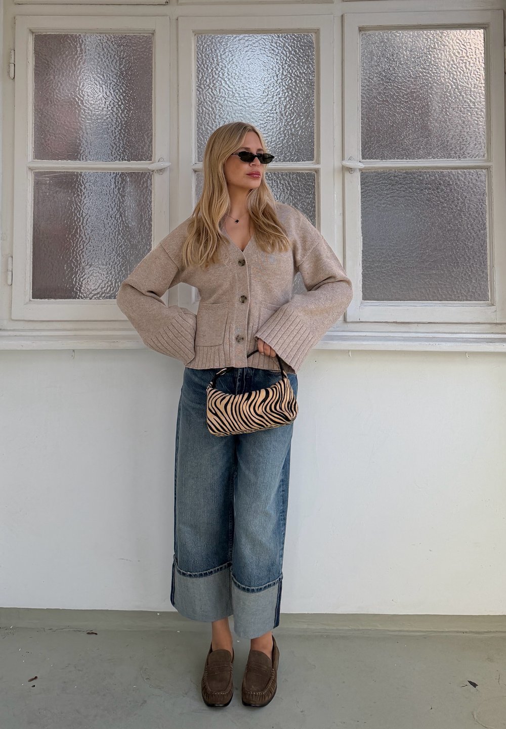 • Femme aux longs cheveux blonds portant des lunettes de soleil, un cardigan beige, un jean large retroussé, des mocassins marron, tenant un sac à main à rayures zébrées à l'intérieur.