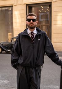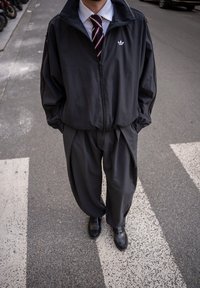 • Homme portant une veste noire Adidas, une cravate rayée, un pantalon noir ample et des chaussures noires, debout sur un passage piéton dans la rue.
