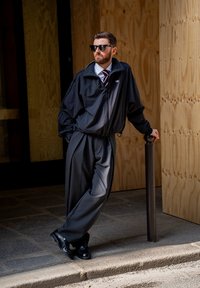 Homme portant une veste en cuir noire, une chemise sombre, un pantalon gris ample à jambes larges, des chaussures noires et des lunettes de soleil, debout à l'extérieur près d'une rambarde en pierre.