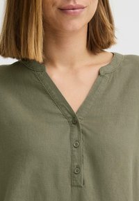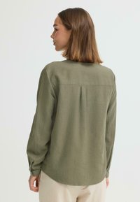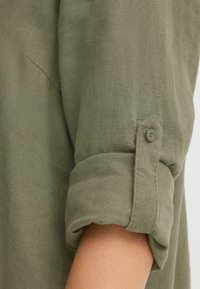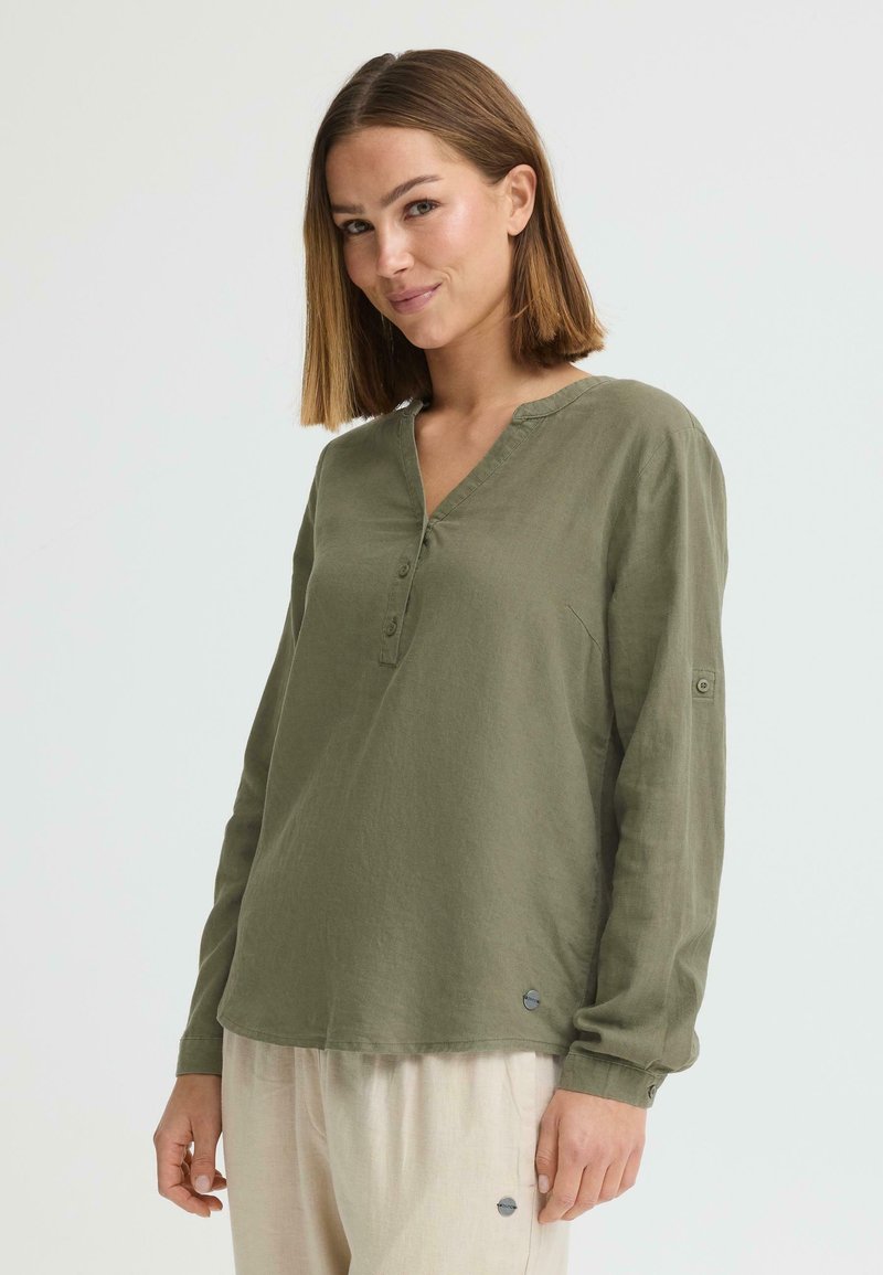 Femme aux cheveux mi-longs portant un chemisier manches longues vert olive et un pantalon beige clair, debout devant un fond blanc uni.