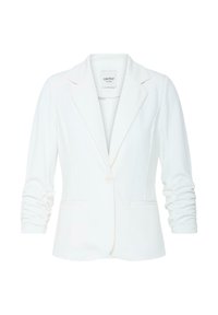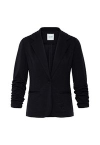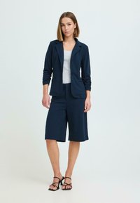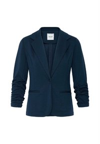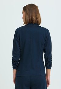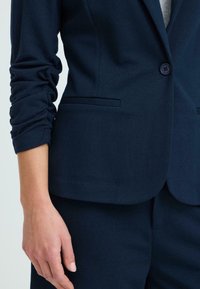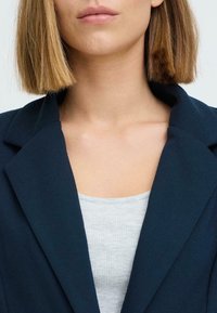 Femme aux cheveux raides mi-longs portant un blazer bleu marine sur un haut gris clair, sur un fond uni clair.