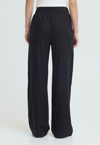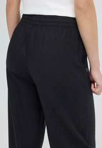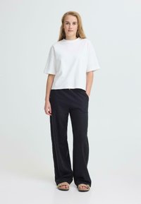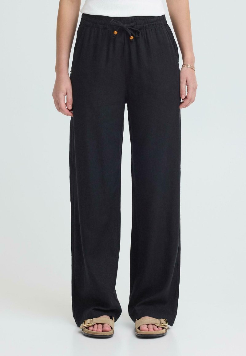 Personne portant un pantalon noir à jambes larges avec une taille élastique et un cordon de serrage, assorti à des sandales beiges à bouts ouverts et un haut blanc.