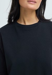 Femme aux longs cheveux noirs portant une robe noire ample arrivant aux genoux, debout avec une main sur la hanche devant un fond clair uni.