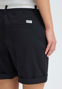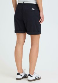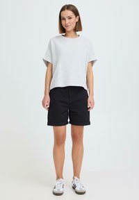 Personne portant un short noir retroussé avec une ceinture tressée blanche et des baskets blanches à rayures noires, debout devant un fond uni.