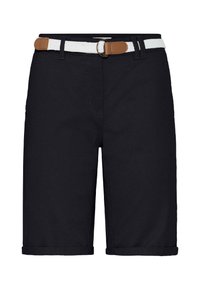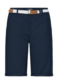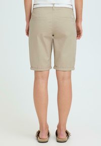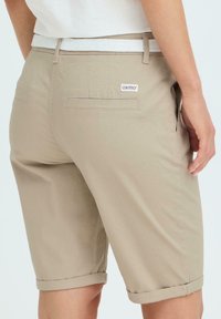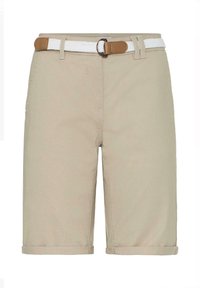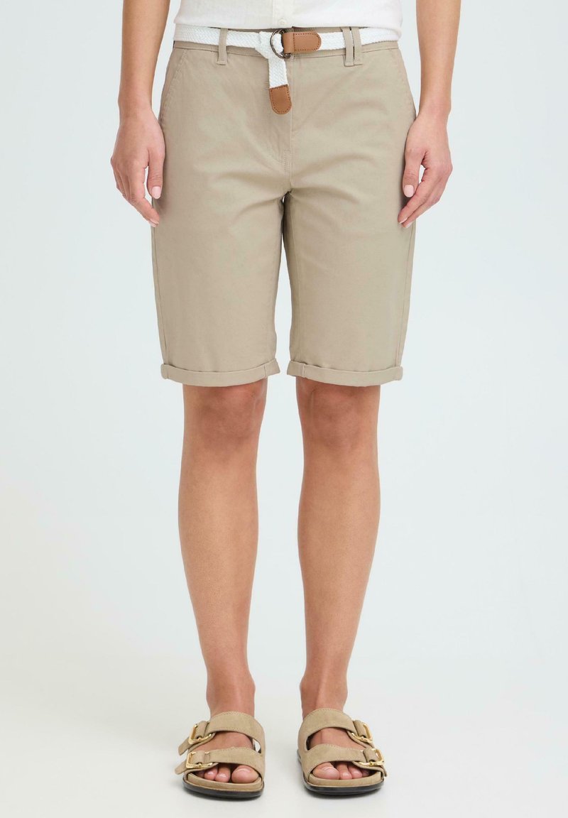 Personne portant un short beige au genou avec des revers roulés, une ceinture blanche tissée et des sandales beiges à boucles dorées.
