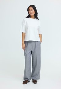 Femme aux longs cheveux foncés portant une chemise blanche ample à manches courtes et un pantalon gris taille haute, sur un fond uni.