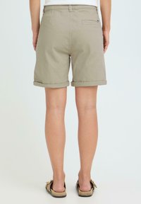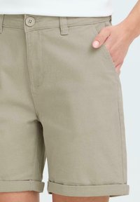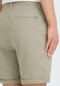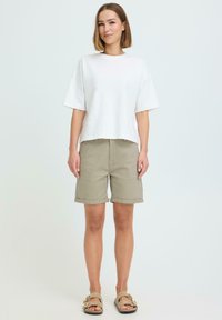 Personne portant un short beige avec ourlet retroussé, debout les bras détendus, assorti de sandales beige à boucle sur un fond uni.