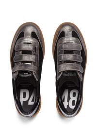 Baskets basses noires et argentées avec trois bandes velcro et une semelle en caoutchouc marron, avec le logo "P448" sur le côté.