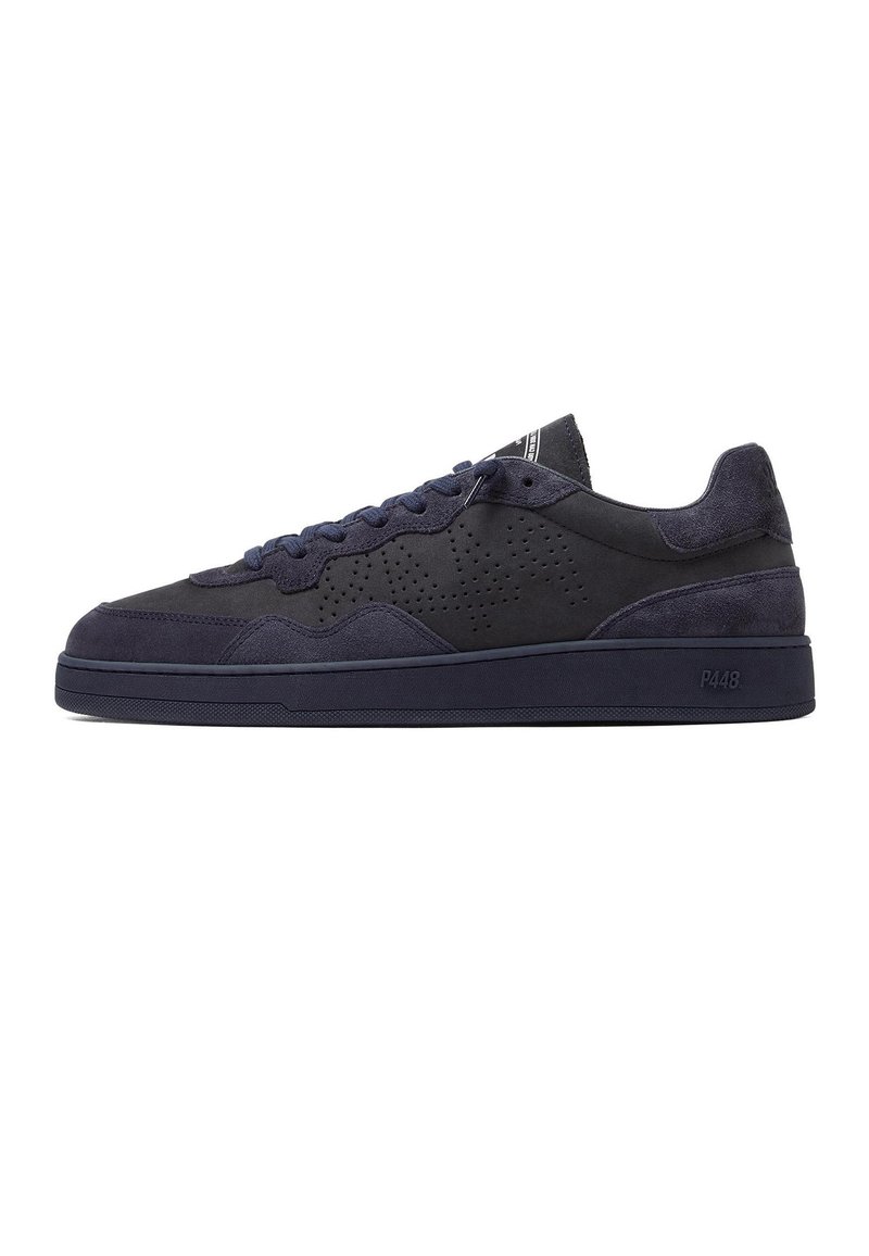 Baskets basses bleu marine foncé avec des panneaux en cuir suédé et perforé, des lacets bleu marine et une semelle épaisse en caoutchouc avec le logo "P448".