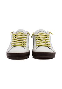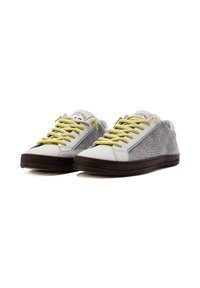 Baskets basses en daim gris et cuir blanc avec lacets jaunes, design latéral perforé et semelle brun foncé.