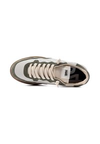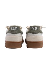 Baskets basses en cuir blanc avec des panneaux en daim olive, logo perforé sur le côté, lacets crème et semelle en caoutchouc marron avec le marquage "P448".