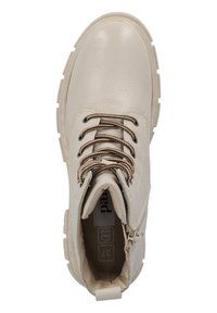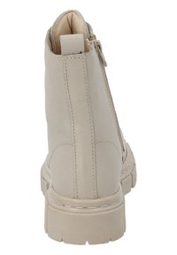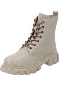 Botte en cuir beige à talon moyen avec bout rond, semelle texturée épaisse et lacets marron. Dispose d'une boucle à l'arrière pour un enfilage facile.