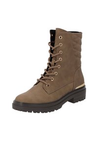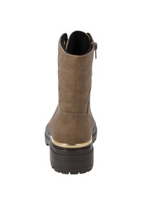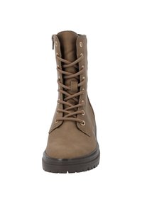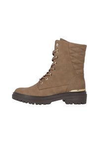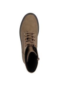 Bottines à lacets marron en suédine, avec un côté texturé, un accent doré sur le talon et une semelle à motif robuste.