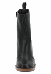 Bottes noires en cuir, à cheville, avec un bout arrondi, une finition texturée et un talon en bois empilé. Équipées d'une languette pour un enfilage facile.