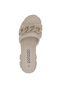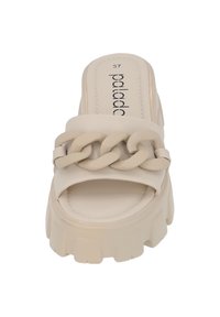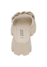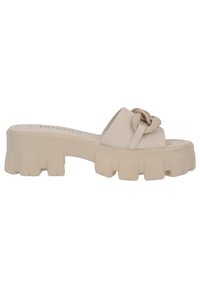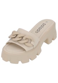 Sandale à talons ouverte beige avec un design à deux brides, mettant en avant une boucle carrée et un talon carré. Fabriquée en matériau synthétique lisse.
