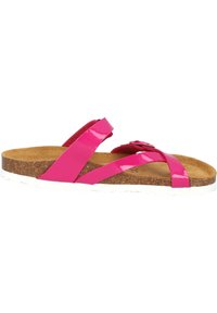 Sandales synthétiques roses avec deux sangles réglables, semelle en liège, semelle en caoutchouc blanc, design plat et finition brillante sur les sangles.