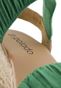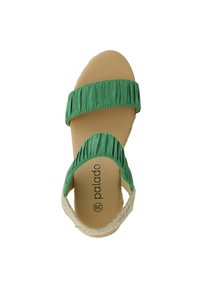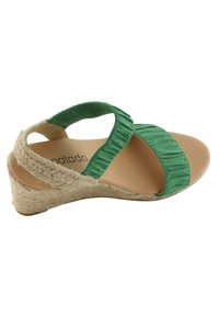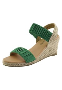 Sandale compensée verte avec une tige en tissu côtelé et une semelle en jute de style espadrille. Elle présente une large bride à la cheville et une semelle intérieure lisse.