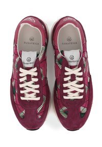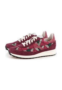 Paire de baskets basses en daim bordeaux, tissu à motifs géométriques, lacets blancs et semelles en caoutchouc blanches sur fond blanc.