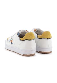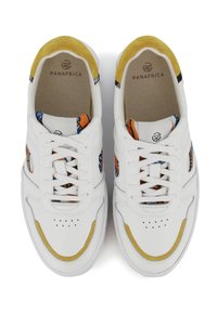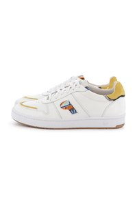 Baskets basses blanches avec des accents de talon en daim jaune et des inserts colorés à motifs sur les côtés et la languette, lacets plats blancs et semelles en caoutchouc.