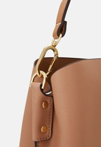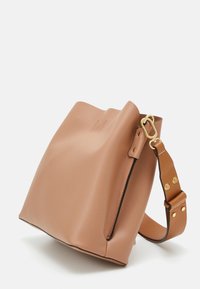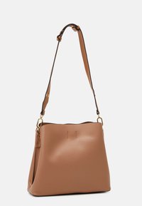 Sac à main en cuir fauve avec bandoulière réglable et garnitures dorées, présenté sur un fond clair uni.