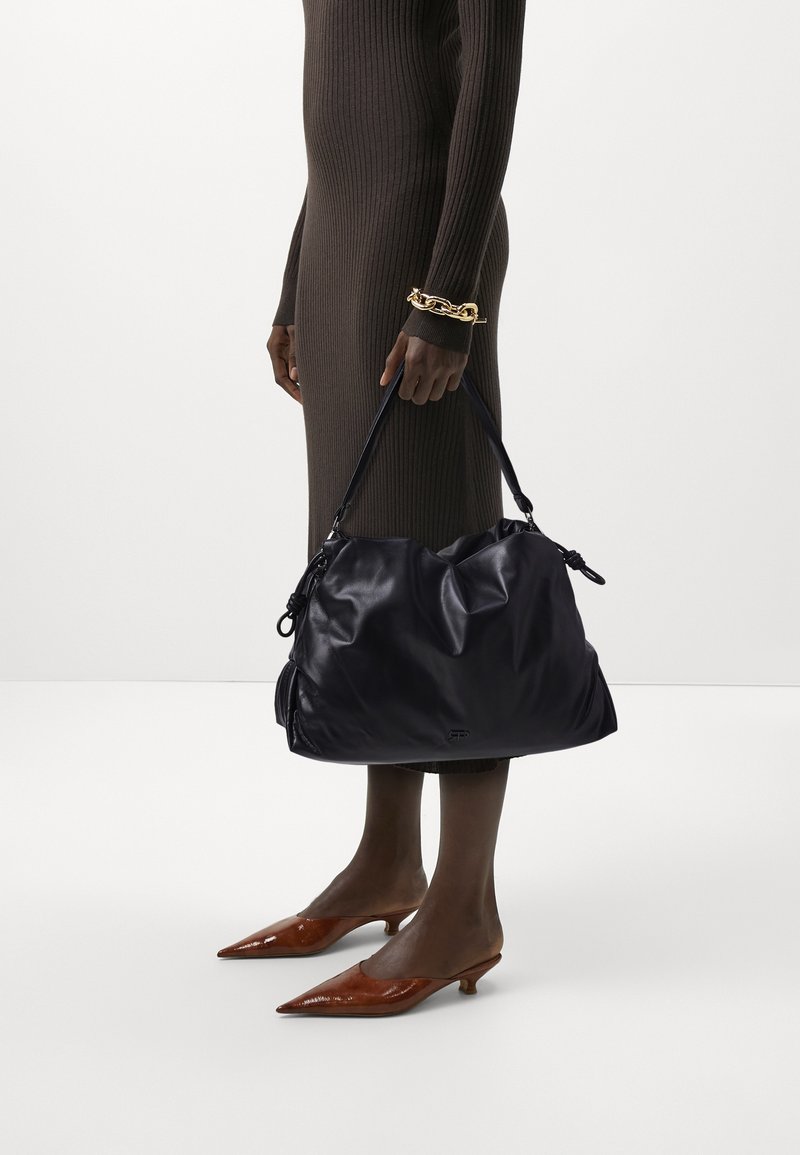 Grand sac à main en cuir noir avec design froncé et bretelles réglables ; porté avec une longue robe brune côtelée et des talons pointus bruns.