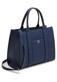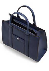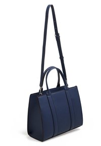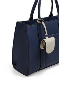 Sac à main en cuir bleu marine avec double poignée, poche avant, fermoir argenté et petite pochette blanche attachée à la poignée gauche.