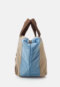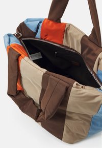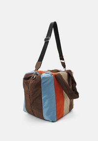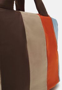 Sac fourre-tout souple et grand avec des rayures verticales marron, beige, orange et bleu, poignées marron et une bandoulière noire réglable.