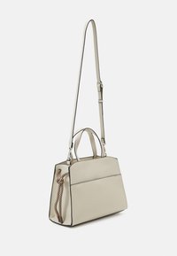 Sac à main en cuir gris clair avec deux poignées courtes, une bandoulière amovible et une poche à rabat sur le devant. Forme structurée avec des lignes épurées.