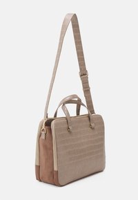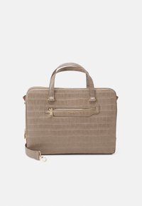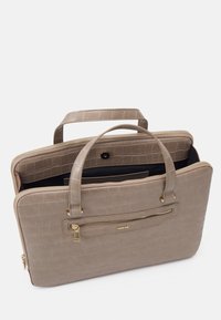 Cartable en cuir taupe effet croco avec double poignée, poche avant zippée et bandoulière détachable avec quincaillerie dorée.